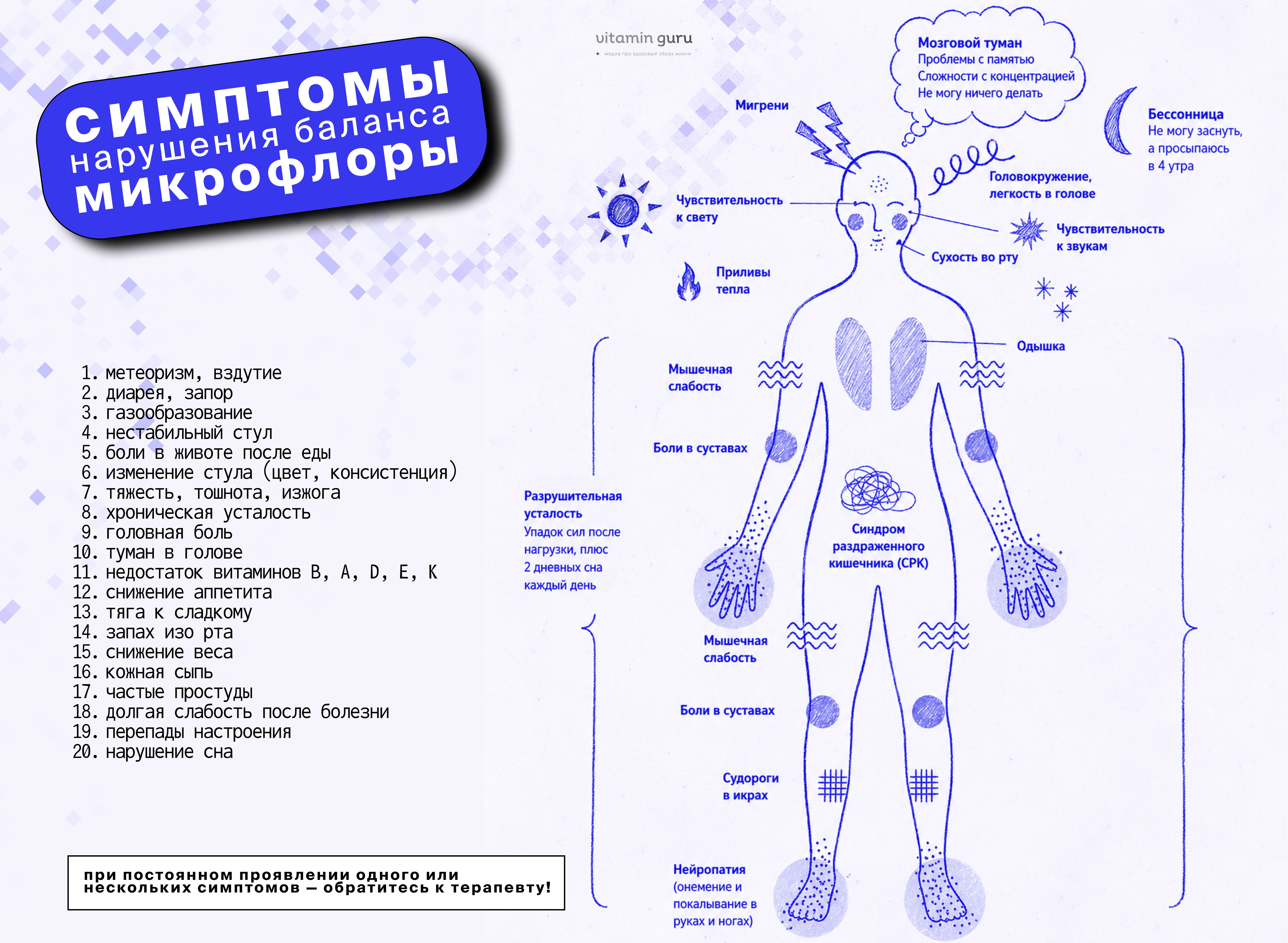 Микрофлора кишечника — это не просто «бактерии в животе». Это полноценный орган-партнёр, который влияет на настроение, иммунитет, обмен веществ и даже качество сна. Когда микрофлора нарушена, организм буквально теряет внутреннее равновесие — и подаёт сигналы, которые мы часто не связываем с кишечником.